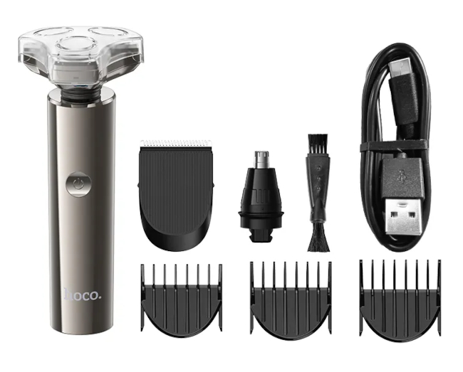 Il kit di rasatura 3 in 1 Hoco HP36 è un dispositivo versatile e impermeabile con certificazione IPX6 che combina un rasoio a testine rotanti, un rifinitore per peli e un rifinitore per naso