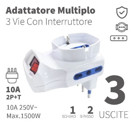 ADATTATORE CON INTERRUTTORE 10A CON 2 USCITE BIPASSO + 1 SCHUKO 16A 250V MAX 1500W