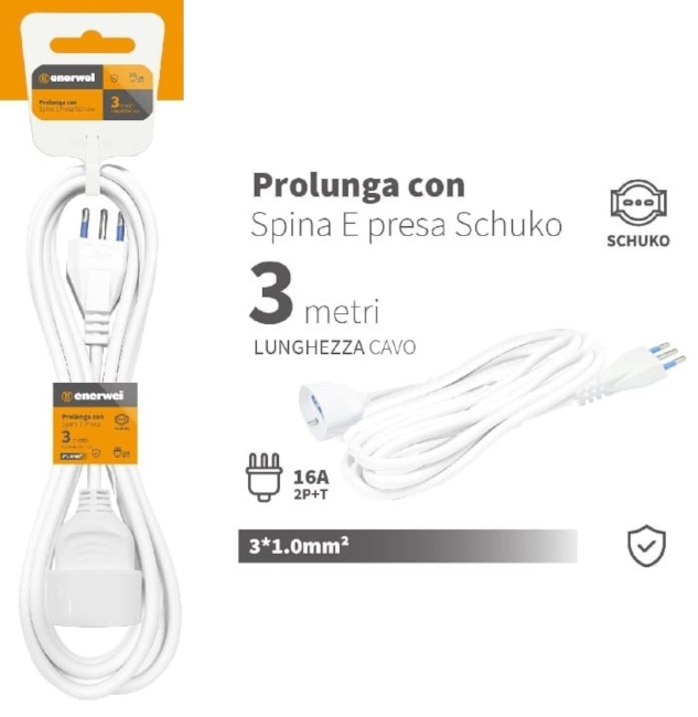 PROLUNGA CON SPINA E PRESA SCHUKO 16A 250V MAX 3680W 3M