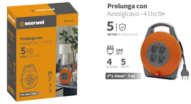 PROLUNGA CON AVVOLGICAVO 4 USCITE SCHUKO 16A 1110W 5M