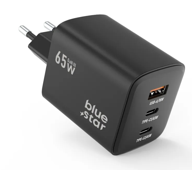 Il caricabatteria Blue Star, alimentato dalla tecnologia GAN, ha una potenza totale di 65W. Supporta gli standard di ricarica Quick Charge 4.0, Power Delivery e Super Fast Charging 2.0 e può caricare smartphone, tablet e laptop. Dispone di tre porte: due USB-C e una USB-A, che consentono di caricare tre dispositivi contemporaneamente