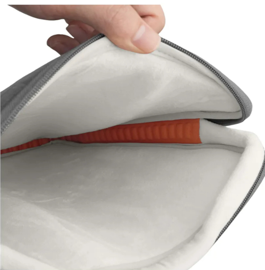 La borsa è dotata anche di una comoda maniglia arancione per un facile trasporto, e una targhetta con logo personalizzato all'esterno aggiunge un tocco di eleganza. È la soluzione perfetta per chi cerca una borsa pratica ed elegante per trasportare un laptop o un tablet fino a 16 pollici