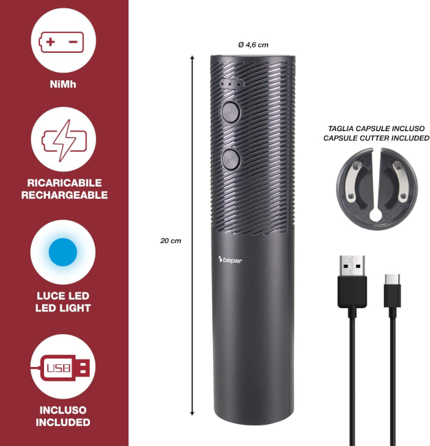 Il cavatappi si ricarica facilmente tramite cavo USB incluso. Ideale per uso domestico e professionale