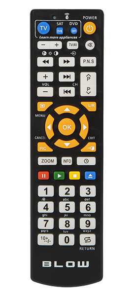 Un moderno telecomando universale con funzione di apprendimento di BLOW, progettato per comandare dispositivi come TV, DVB, SAT, DVD della maggior parte delle marche disponibili sul mercato. Il prodotto si distingue per il suo funzionamento intuitivo e numerosi pulsanti funzione. Il set include un manuale di istruzioni dettagliato