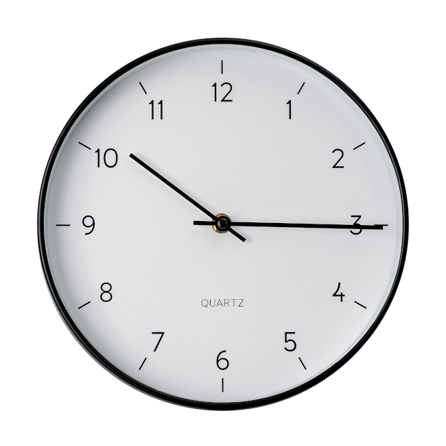 Elegante orologio da parete con un diametro di 25cm e uno spessore di 4cm, realizzato in plastica nera temprata di alta qualità.