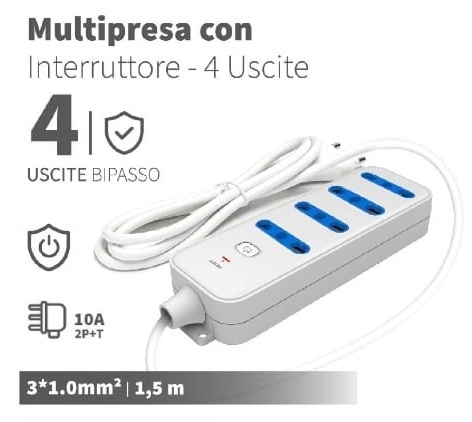 MULTIPRESA CON INTERRUTTORE A 4 USCITE 10A 230V MAX 2300W 1.5M