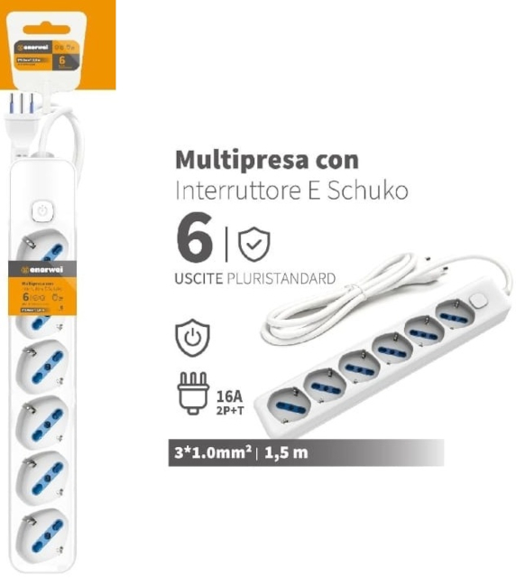 MULTIPRESA CON INTERRUTTORE A 6 USCITE 16A 250V MAX 3680W 1.5M