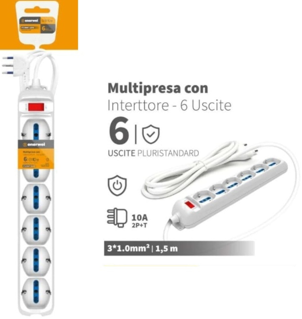 MULTIPRESA CON INTERRUTTORE A 6 USCITE 10A 250V MAX 2300W 1.5M