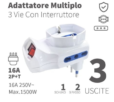 ADATTATORE CON INTERRUTTORE 16A CON 2 USCITE BIPASSO + 1 SCHUKO 16A 250V MAX 1500W